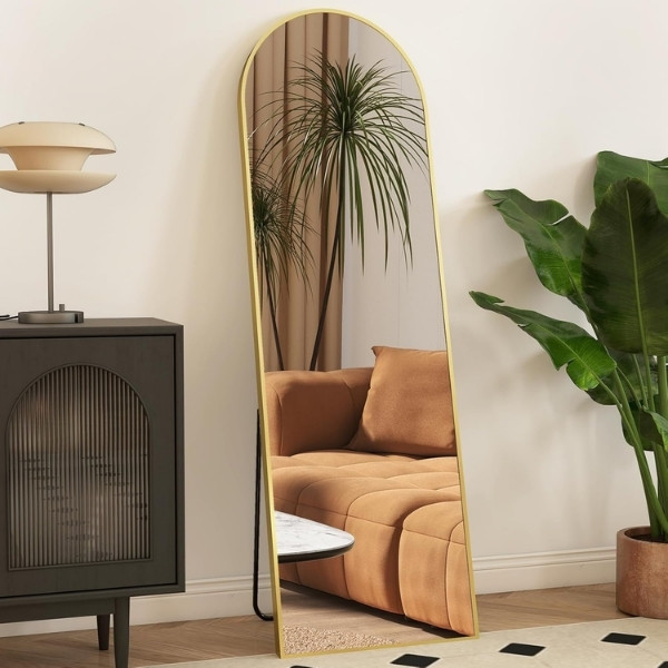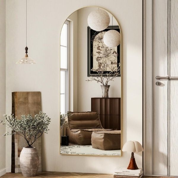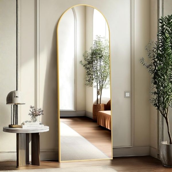This full length mirror brings arched elegance to bedrooms or entryways. Gold frame upgrades plain walls fast for big space feel. Stand for daily routine checks or hang to save floor. Strong glass handles light use well. Perfect trendy pick for modern homes.